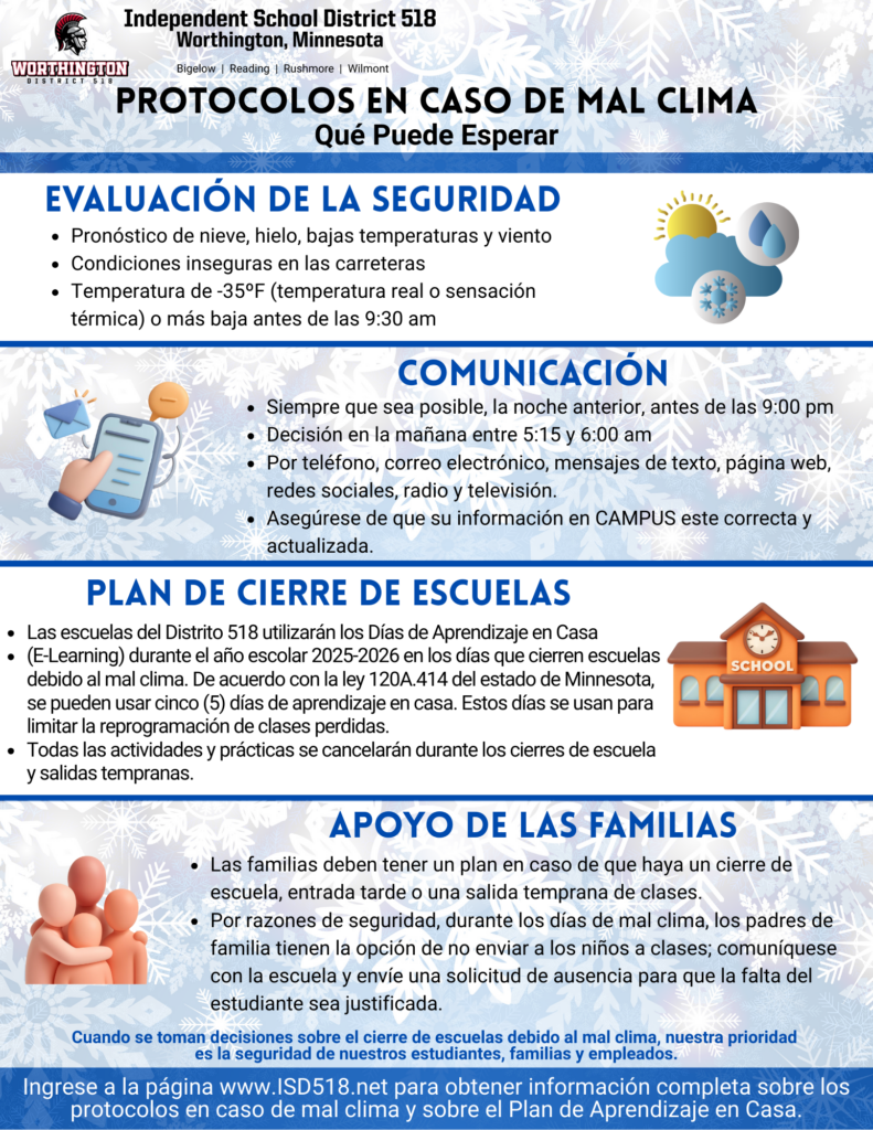 Go to ISD518.net for full weather protocols and Learn from Home Plan.