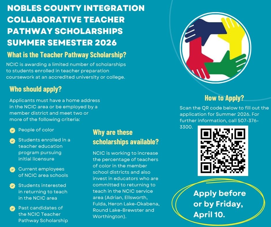 NCIC is working with its member districts to increase the percentage of teachers of color in each district. We are dedicated to investing in educators committed to teaching in rural Minnesota schools, especially those in the NCIC service area which includes the school districts of Adrian, Ellsworth, Fulda, Heron Lake-Okabena, Round Lake-Brewster, and Worthington. We want to ensure that our students have access to a diverse teaching staff, who are teaching in their field, and who are committed to providing high-quality, equitable education to all students.